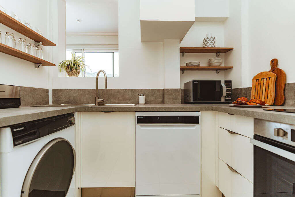 Cuisine neuve entièrement équipée : plaque induction, four, lave-vaisselle, micro-ondes, lave-linge